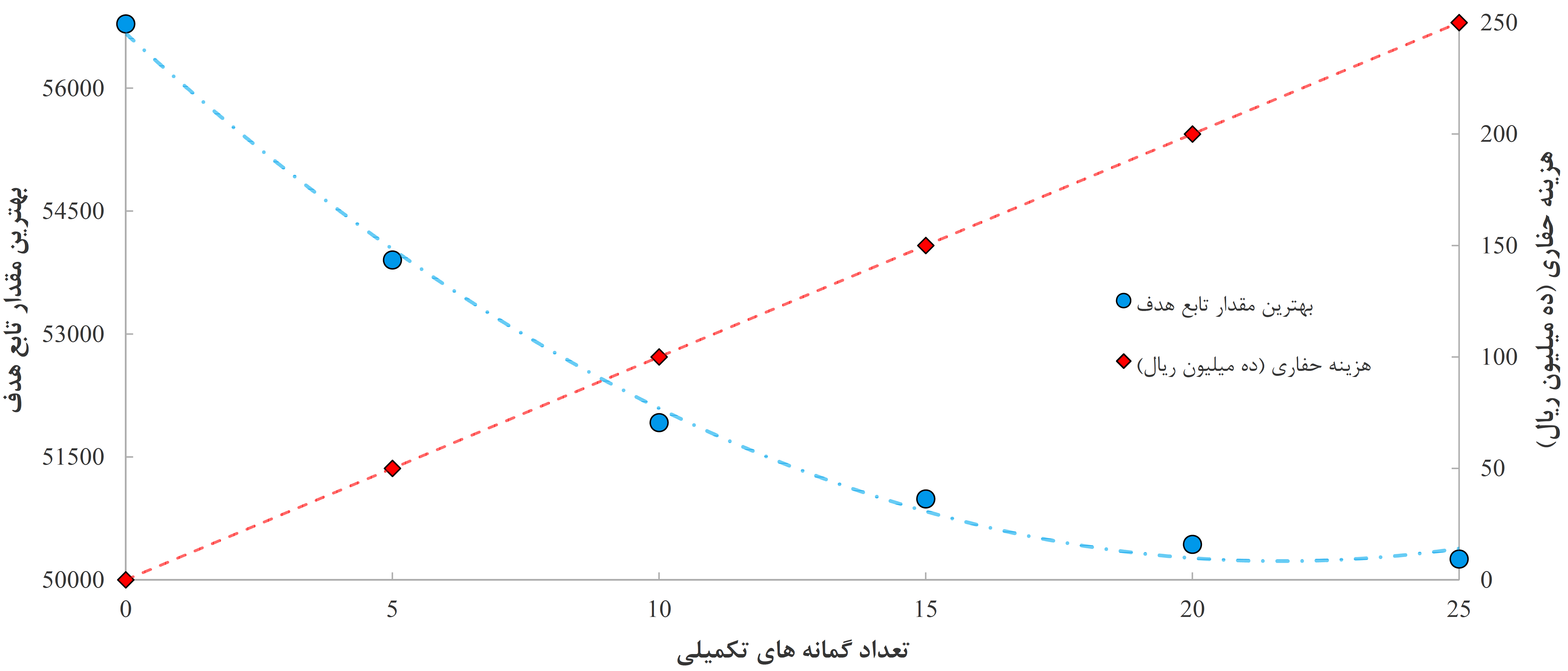 بهمنظور تعیین تعداد گمانههای بهینه موردنیاز جهت حل مسئله نیز میتوان از برقراری توازن میان تأثیر افزایش تعداد گمانه حفاری تکمیلی بر تغییرات تابع هدف و هزینه حفاری استفاده کرد. بدینصورت که مسئله برای تعداد مختلف گمانههای تکمیلی حل و با توجه به منحنیهای مبادلهای بین تغییرات تابع هدف و هزینه حفاری به ازای افزایش تعداد گمانههای تکمیلی، تعداد بهینه گمانههای موردنیاز جهت حل مسئله تعیین میشود. روند کاهشی تابع هدف در ازای اضافه شدن تعداد کم گمانه شدید خواهد بود. با علم به این نکته که هرچه تعداد گمانههای تکمیلی افزایش یابد، کاهش بیشتری را در تابع هدف مشاهده میشود، اما از نقطهای خاص (تعداد گمانه بهینه) به بعد، تغییرات تابع هدف چندان زیاد نیست و با در نظر گرفتن روند افزایشی هزینه هنگفت عملیات حفاری، کاهش نهچندان محسوس تابع هدف توجیهپذیر نیست.
